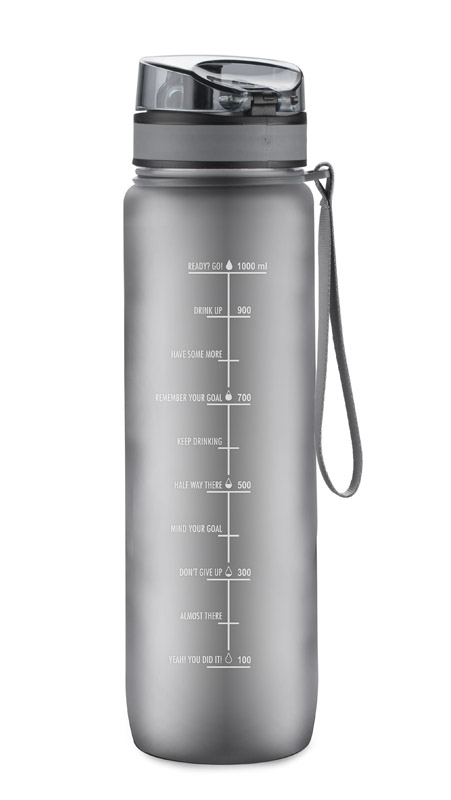 Bidon motywacyjny MOTIVA posiada pojemność aż 1000 ml, dzięki czemu możemy mieć dużą ilość płynu pod ręką. Na ściance butelki nadrukowana jest miarka motywująca w języku angielskim. Korzystając z tej butelki możemy dokładnie monitorować ilość wypitej wody. Sięganie po wodę staje się frajdą.