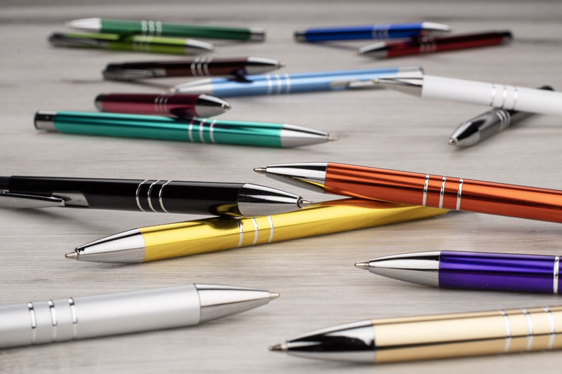 Metalowy długopis KALIPSO o metalizowanej chromowanej powierzchni. Długopis automatyczny z 3 ringami i niebieskim wkładem. Logo grawerujemy na powierzchni długopisu.