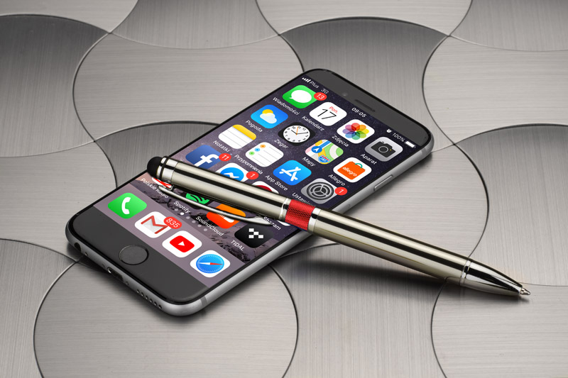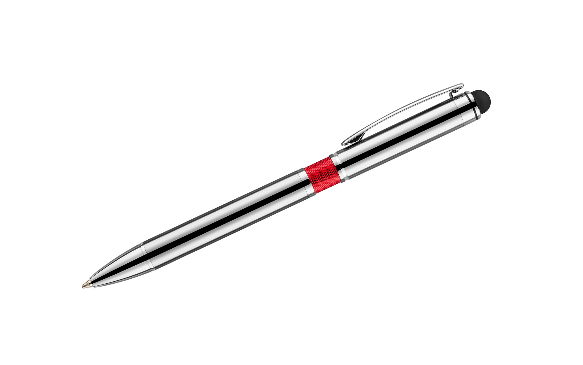 Elegancki metalowy długopis z kolorową aplikacją na korpusie oraz touchpenem.