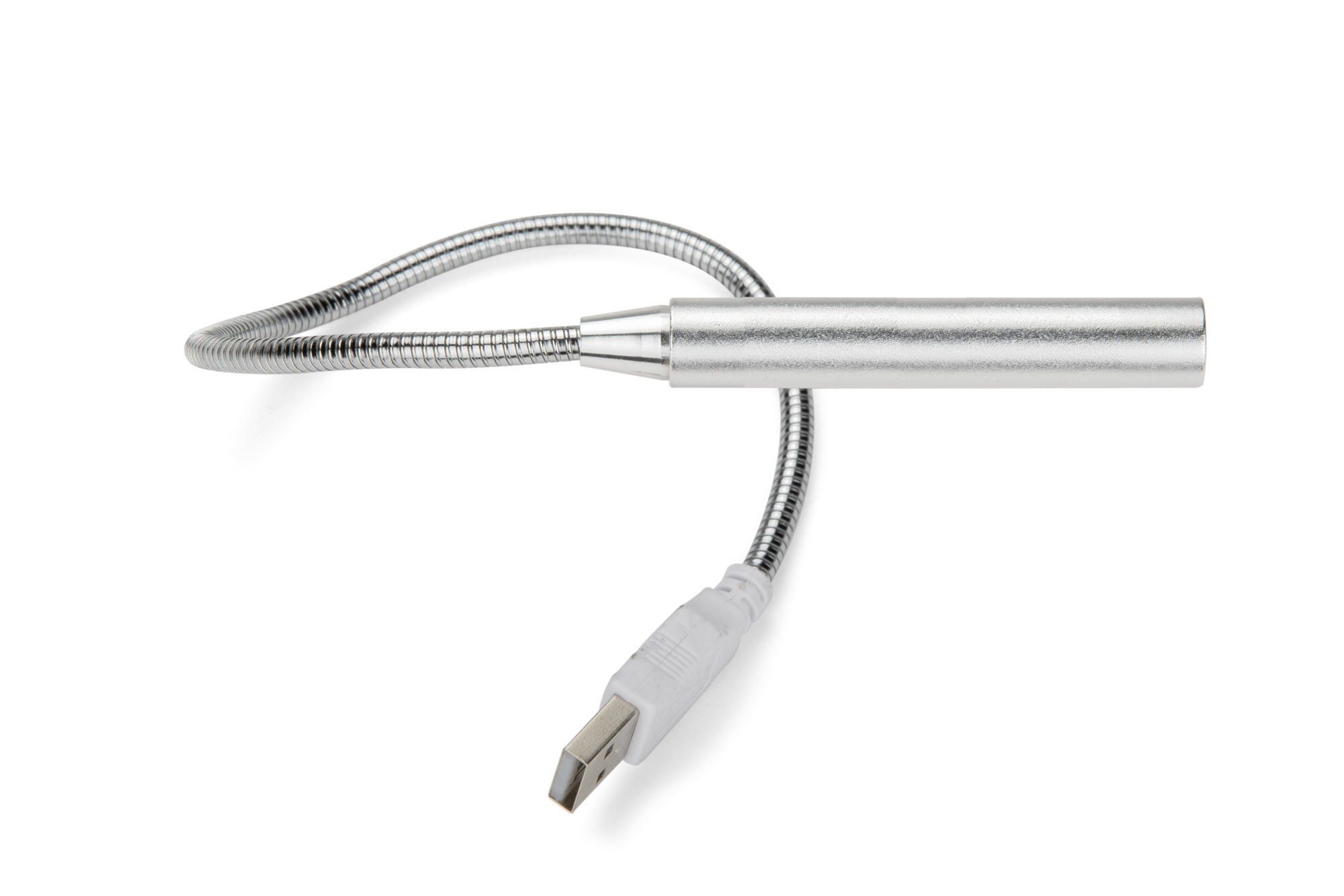 Lampka wykonana z metalu zasilana energią z portu USB, np. z laptopa lub power banka. Posiada elastyczny pałąk pozwalający na precyzyjne ustawienie lampki oraz 5 diod LED.