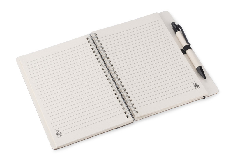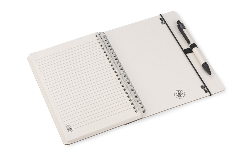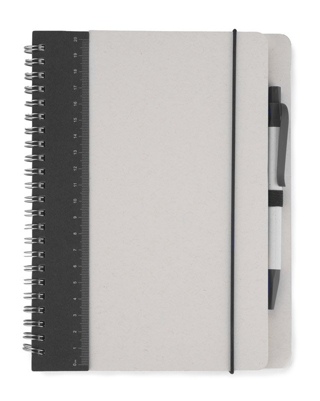 Notes REGALI wraz z długopisem wykonane są z kartonów po mleku. Długopis posiada wkład w kolorze niebieskim. Do notesu dołączona jest linijka o długości 20 cm pasująca kolorem do wykończeń na długopisie. Gumka na długopis oraz ta zamykająca notes w kolorystyce wykończeń długopisu.
