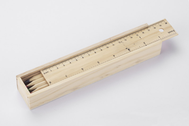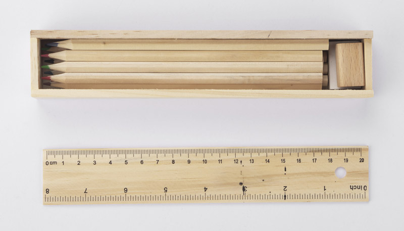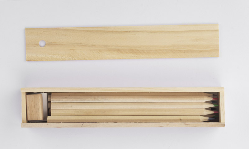 Drewniany piórnik wyposażony w dwanaście drewnianych kredek, linijkę, gumkę oraz temperówkę. Logo grawerujemy bezpośrednio na pudełku.