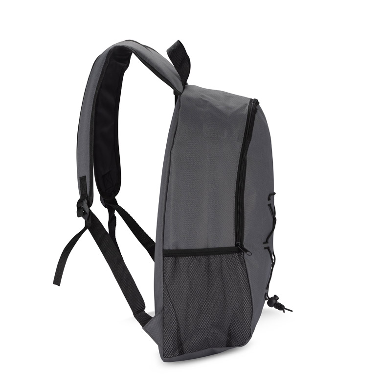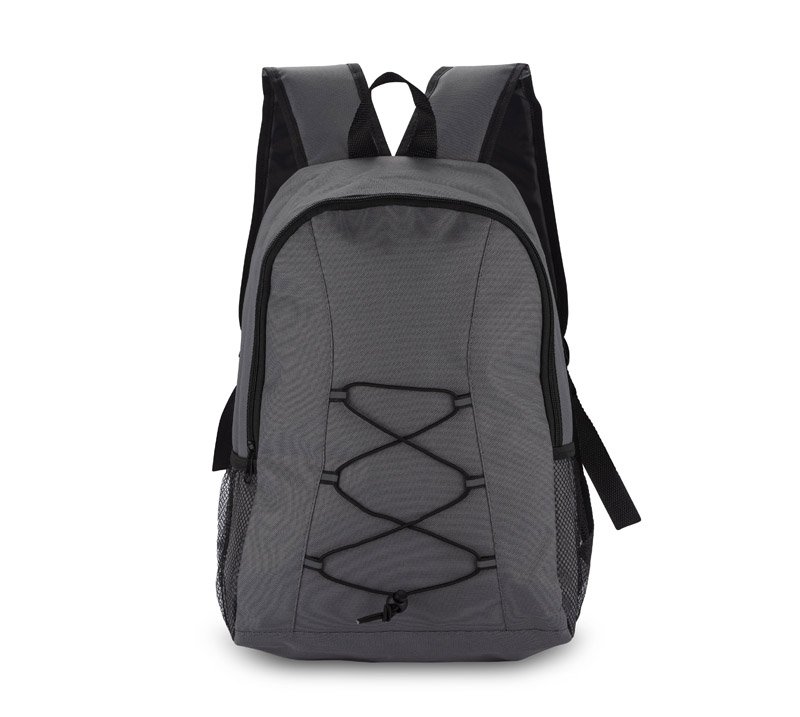 Plecak KAPIRO wykonany z poliestru 600D. Posiada jedną komorę główną zamykaną na zamek oraz dwie siateczkowe kieszonki boczne. Czarne gumki pełnią praktyczny element podróży – można wykorzystać to miejsce do zapakowania małego kocyka lub lekkiej kurtki.