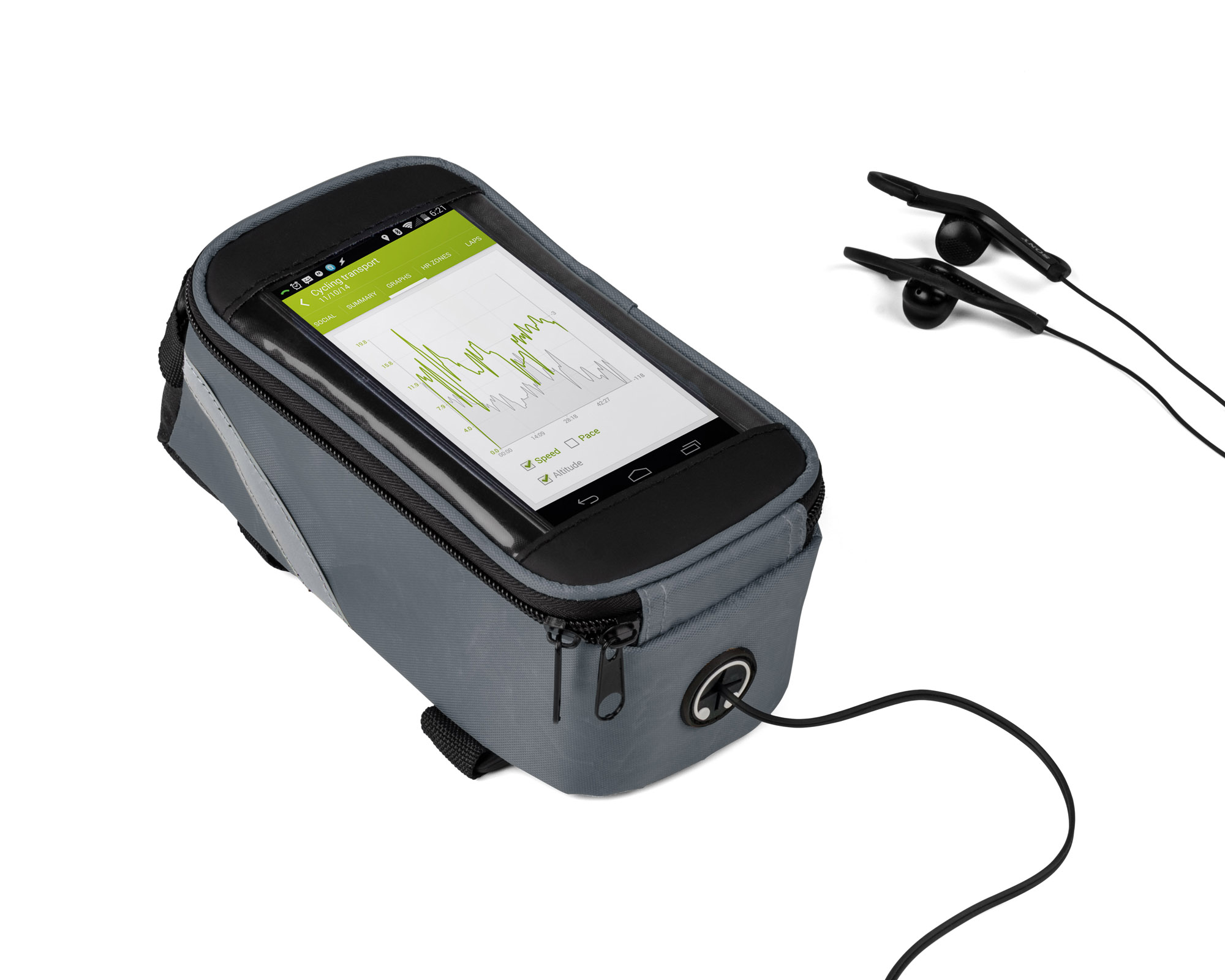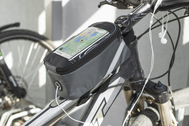 Solidnie mocowana do ramy torba rowerowa posiada pojemną, zapinaną na zamek komorę na drobne przedmioty. Dodatkowo w torbie VELO znajduje się wyjście na słuchawki oraz kieszonka z folią dotykową na smartfona, która umożliwia korzystanie z telefonu bez konieczności wyciągania go z torby. Spoglądanie na nawigację czy sterowanie odtwarzaczem muzyki nie stanowi żadnego problemu, nawet podczas jazdy na rowerze.