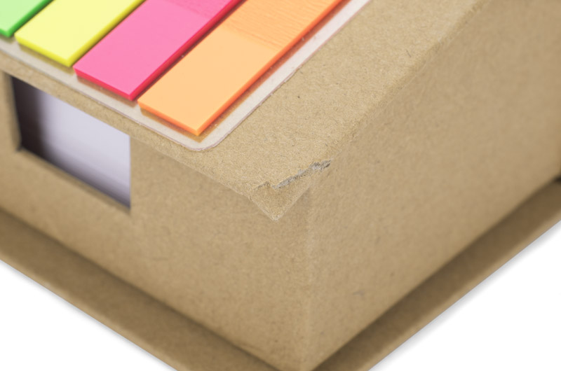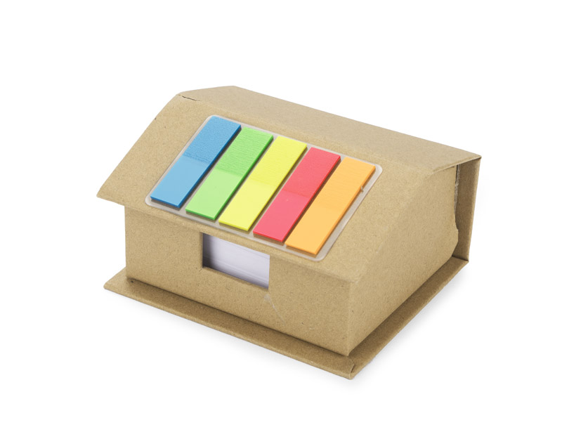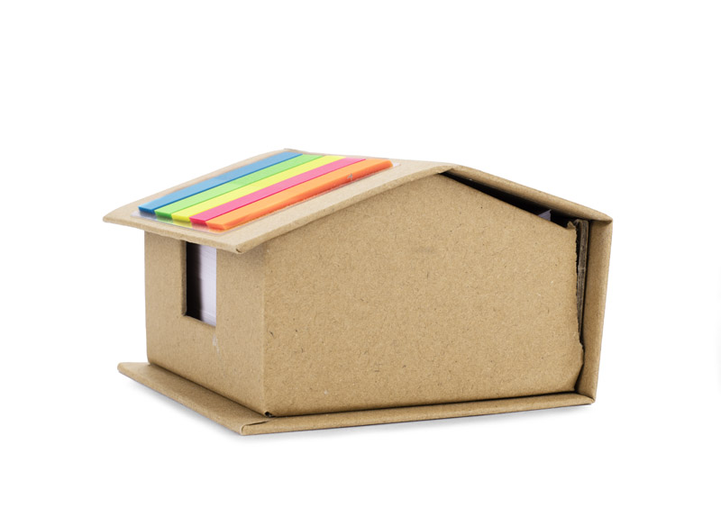 Ekologiczny pojemnik na karteczki ( 370 szt.) w kształcie domku. Dodatkowo znaczniki samoprzylepne w pięciu kolorach (po 25 znaczników w każdym kolorze). Logo wykonamy na powierzchni dachu.