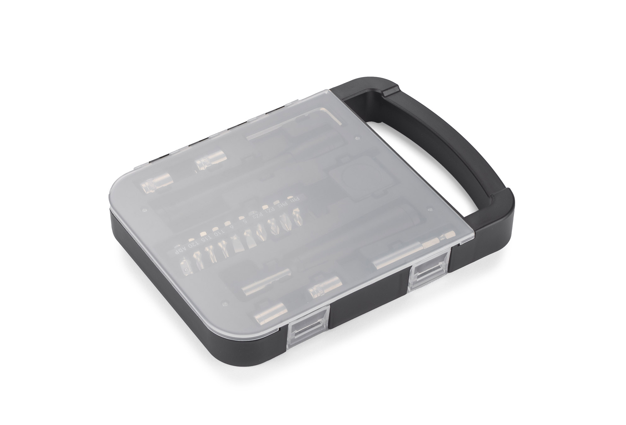 FIXO to zestaw narzędzi w praktycznej obudowie. Wewnątrz znajdują się: klucz imbusowy, latarka, miara, wkrętak, dziesięć różnych bitów, przedłużka i cztery końcówki nasadowe 7mm, 8mm, 9mm i 10mm.
