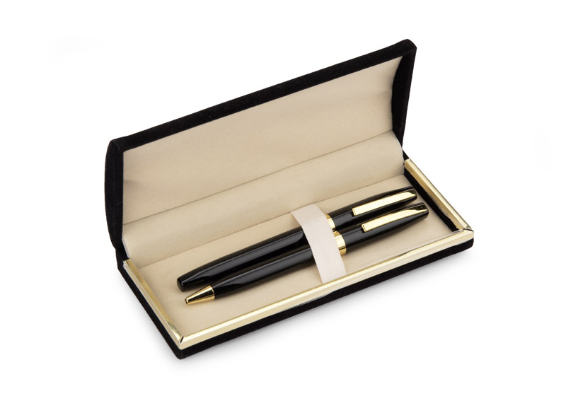 Komplet piśmienniczy ze złotymi wykończeniami pakowany w etui wykonane z eleganckiego czarnego weluru. W komplecie znajduje się długopis oraz pióro kulkowe. Logo wygrawerujemy w kolorze złotym na długopisie i piórze kulkowym w ich górnej części.