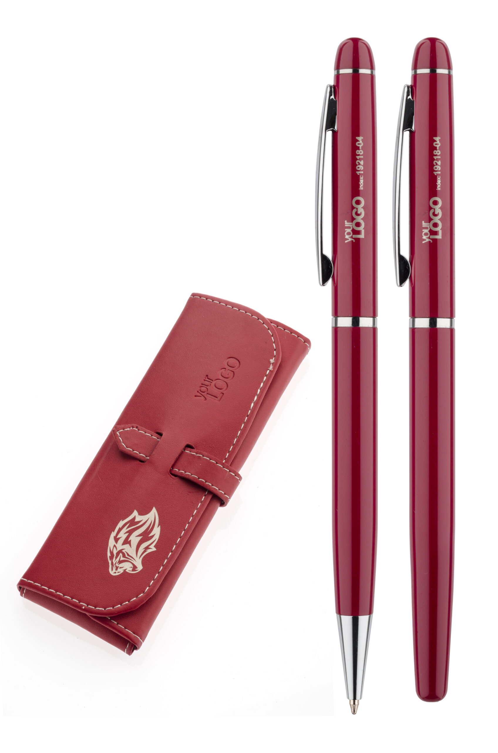 Elegancki zestaw piśmienniczy pakowany w etui z ekoskóry PU. W zestawie znajdują się długopis oraz pióro kulkowe. Logo wygrawerujemy na powierzchni artykułów piśmienniczych. Możliwość wygrawerowania logo także na etui.