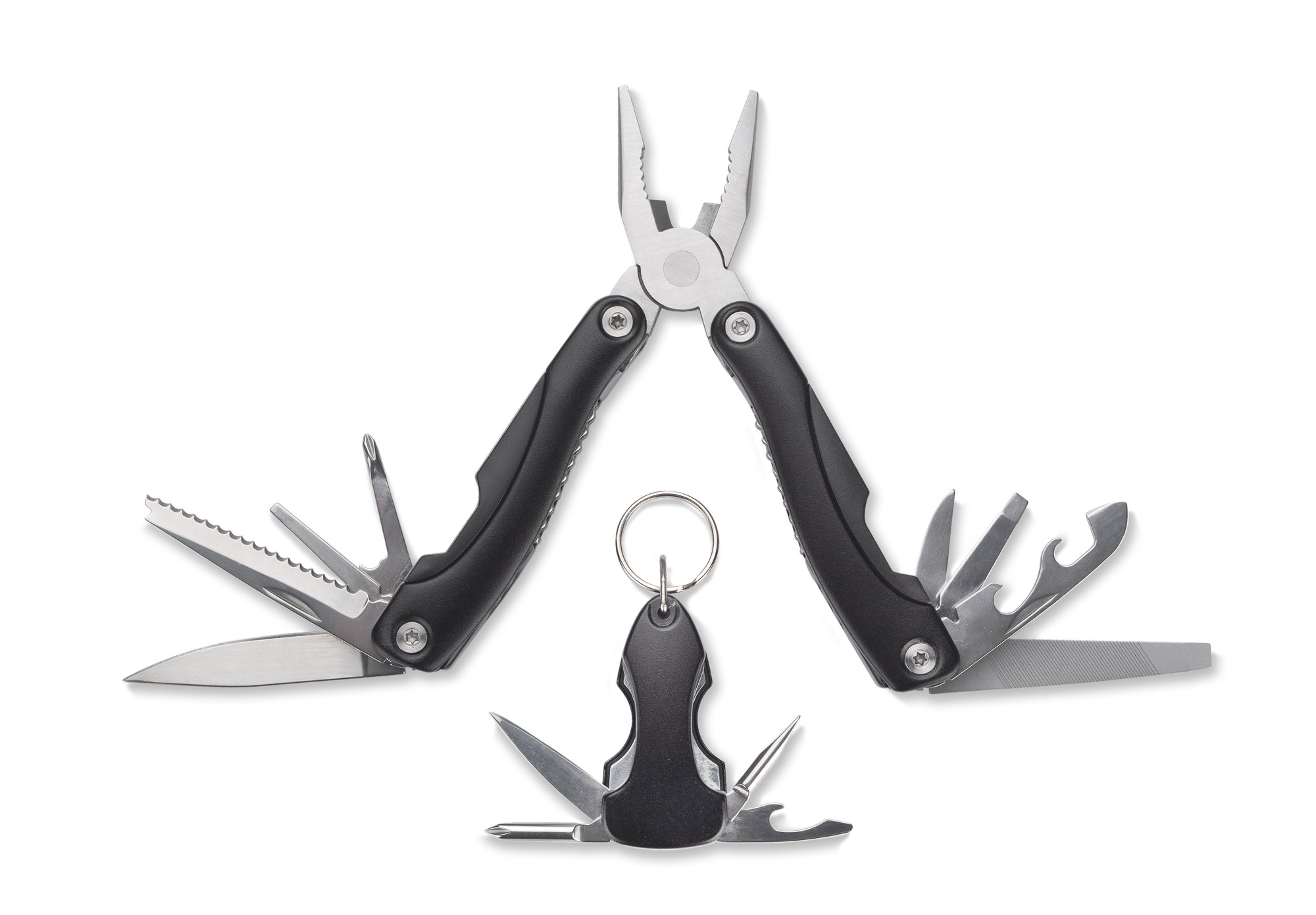 TOOL to zestaw składający się z narzędzia wielofunkcyjnego i breloka narzędziowego. Funkcje narzędzia: kombinerki, przecinak, nóż o gładkim ostrzu, piła, śrubokręt płaski i krzyżowy, pilnik, otwieracz do puszek i butelek. Wyposażony w blokadę wszystkich elementów. Funkcje breloka: nóż, śrubokręt płaski i krzyżowy, otwieracz do butelek, latarka. Oba gadżety zapakowane zostały w ekologiczne, kartonowe pudełko. Wymiary narzędzia wielofunkcyjnego 102 x 43 x 23 mm, wymiary breloka 30 x 60 x 18 mm